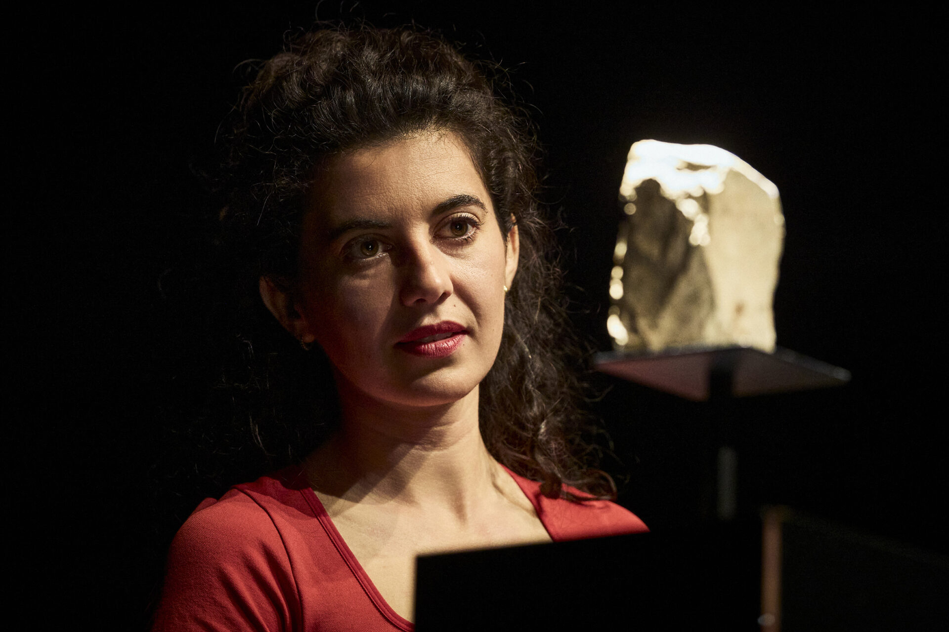 Il faut peut-être parfois s’arrêter et prendre le temps de vivre, d’écrire. Du temps pour aller à l’essentiel, vers ce qui résiste à l’expression, ce qui sourd pourtant sous la chape du silence. On a pu dire que l’autofiction était le geste de jeunesse d’écrivain·es, ici, elle apparaît plutôt comme une forme de maturité. La luxuriance du verbe a laissé place au dépouillement. Presque rien, sur une scène aux allures de salle de musée, ou plutôt de mémorial. Le beau travail lumière de Willy Cessa sculpte l’espace et peu à peu nous plonge dans l’obscurité. Nous pouvons ainsi imaginer ce que ressentit Faustine dans le tunnel creusé par les Républicains de Belchite. Seule irradie une pierre, vestige d’un autre temps. L’autrice devient psychopompe.