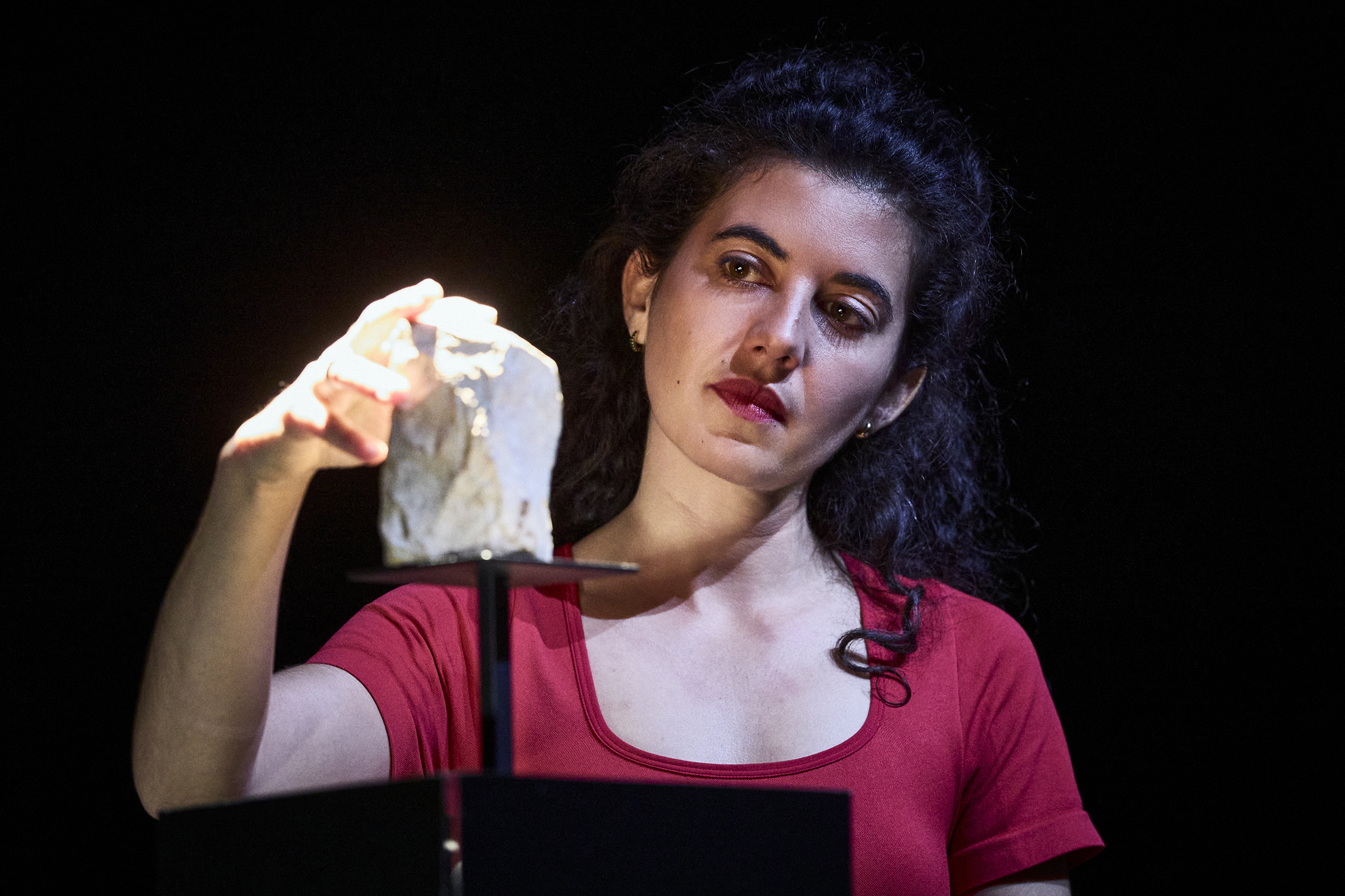 Il faut peut-être parfois s’arrêter et prendre le temps de vivre, d’écrire. Du temps pour aller à l’essentiel, vers ce qui résiste à l’expression, ce qui sourd pourtant sous la chape du silence. On a pu dire que l’autofiction était le geste de jeunesse d’écrivain·es, ici, elle apparaît plutôt comme une forme de maturité. La luxuriance du verbe a laissé place au dépouillement. Presque rien, sur une scène aux allures de salle de musée, ou plutôt de mémorial. Le beau travail lumière de Willy Cessa sculpte l’espace et peu à peu nous plonge dans l’obscurité. Nous pouvons ainsi imaginer ce que ressentit Faustine dans le tunnel creusé par les Républicains de Belchite. Seule irradie une pierre, vestige d’un autre temps. L’autrice devient psychopompe.