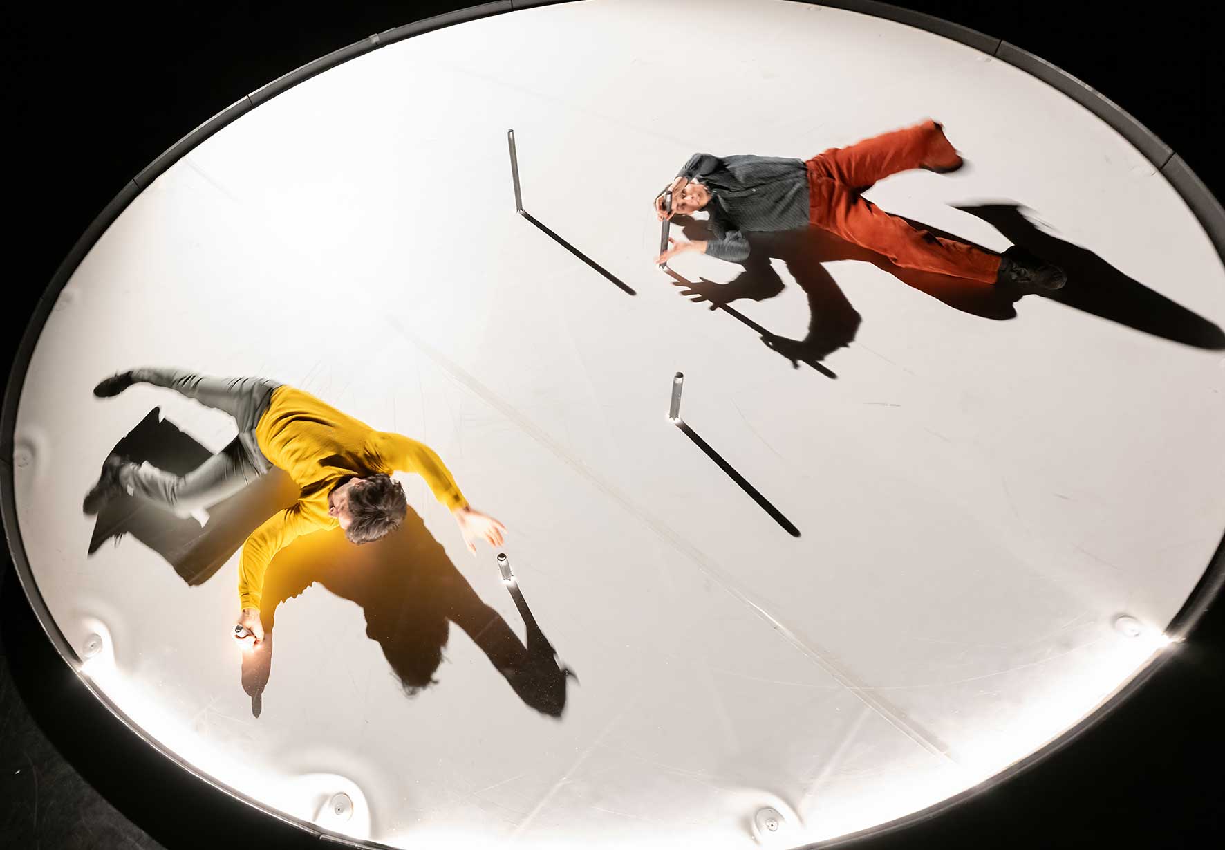 Soumis aux aléas de la force centrifuge et à des inclinaisons fortuites, les interprètes prennent en effet de sérieux risques. Sans contrôle, les mouvements induits par l’agrès dépeignent un monde imprévisible, à la gravité altérée. Sur ces rotations impressionnantes, le duo invente des déplacements incongrus. Dans leurs courses ascensionnelles sans fin, les chutes semblent toutefois amorties. Remarquablement chorégraphiées, les acrobaties sont originales. Jonathan Guichard est de ces artistes qui conçoivent leurs propres agrès, afin de répondre à ses « envies d’état de corps particuliers ».